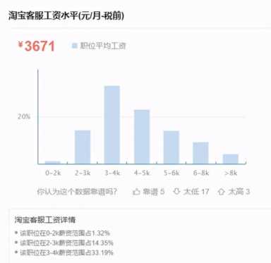 3.淘宝客服平均月薪3671元。客服的应聘条件:年龄18-40岁之间,女性较多,高中及以上学历;普通话标准,有良好的语言表达能力和沟通能力,会基本的计算机操作;喜欢与人沟通,具备良好的学习能力和沟通能力;热爱销售工作,积极乐观,性格坚韧,勇于进取和挑战。