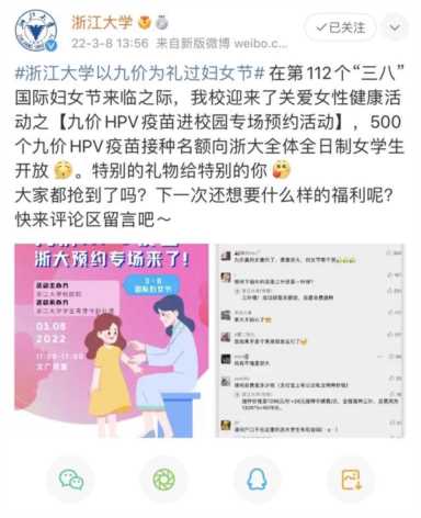 第112个“三八”国际妇女节来临之际,浙江大学在官微发布消息称,学校向全体全日制女学生开放500个九价HPV疫苗接种名额。