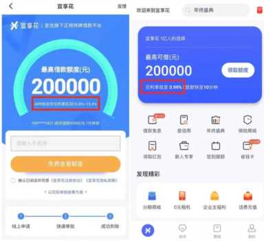 除了违法违规收集用户信息,宜享花的贷款产品利率表述存在问题。据悉,宜享花APP在引流广告中对贷款利率的表述为“宜享花贷款产品的APR综合年化利率区间为10.8%—15.4%”,而在APP首页上标示的利率则为“日利率低至0.99%”。
