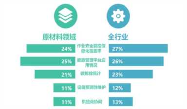 原材料领域具有大型制造装备密集、能源消耗总量大、碳排放与污染物排放强度高、作业安全要求严格等特点。平台数据分析结果显示,原材料领域中企业能源管理平台应用率达25%,碳排放统计率达21%,11%的企业针对大型制造设备进行预测性维护,11%的企业实现供应链协同。