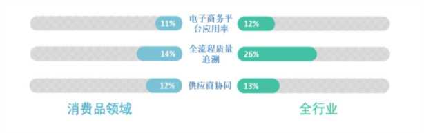 消费品工业对质量控制要求严格、对供应链稳定需求迫切,具备丰富的市场营销渠道。平台数据分析结果显示,消费品工业中电子商务平台应用率为11%,全流程质量追溯实现率达14%,12%的企业实现供应链协同。