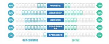 电子信息领域对装备自动化程度要求偏高,对质量过程管控严格,具有信息系统覆盖广泛、生产运营管理高效等特点。平台数据分析结果显示,电子信息产业中18%的企业搭建了专用网络环境,42%的企业实现工业信息安全防护,35%的企业在质量检测环节应用了在线检测平台,37%的企业应用了自动化物流设备,7%的企业实现了生产智能运营决策。