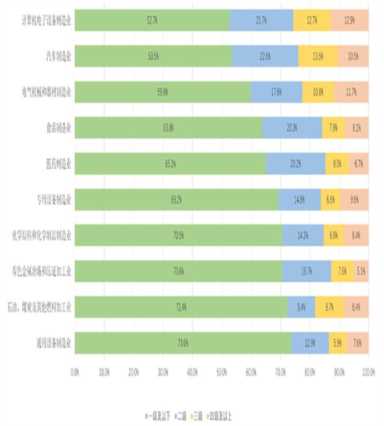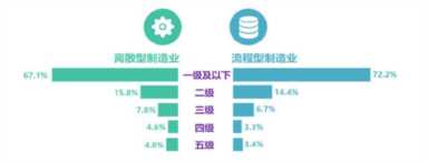 从行业来看,离散型制造业的成熟度水平整体高于流程型制造业。离散型制造企业一级及以下占比约为67.1%,低于流程型制造企业的72.2%,处于二级、三级的离散型制造企业占比较流程型制造企业高出2.5个百分点,处于四级及以上的离散型制造企业数量较流程型制造企业高出2.7个百分点。