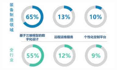 装备制造领域具有研发技术壁垒高、客户定制化需求多、售后运维成本高、上下游产业关联度高以及应用领域广泛等特点。平台数据分析结果显示,装备制造业65%的企业开展了基于三维模型的数字化设计,13%的企业提供了产品的远程运维服务,10%的企业建立了产品的个性化定制平台。