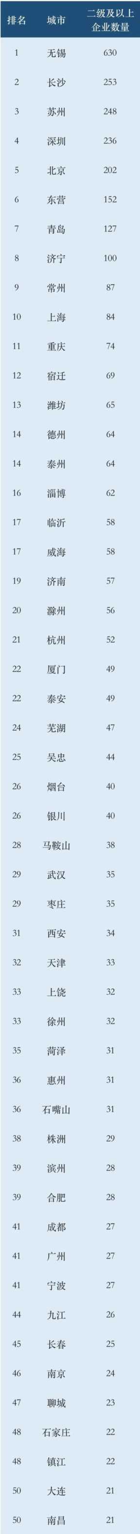全国城市级参与智能制造能力成熟度自评估且达到成熟度二级及以上的企业数量排名(2021年),TOP50城市如下表所示: