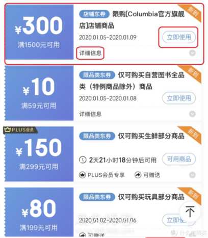 这种一般都是在第三方店铺会有的店铺东券,这种如上图红框里的优惠券很好理解,就是在特定店铺使用的东券,也简称为店铺券,基本上哪一家店铺领的就在哪一家用,也可以点击详细信息查看或者直接看可用商品是哪一个店铺的。