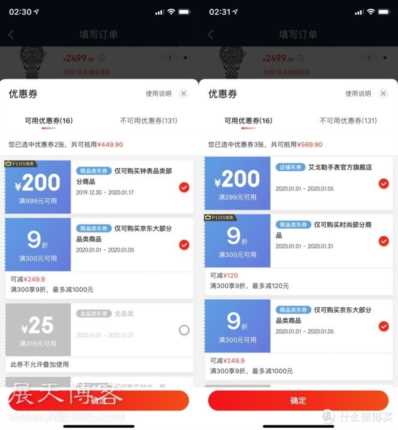 我其实是先翻到的这款表,发现了默认结算的时候选用优惠券是左图这样,因为优先选了最废限品类东券,就无法和店铺券、普通可叠加限品类一期叠加了。