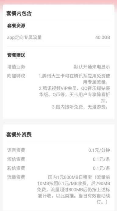 第二张卡:19元腾讯大王卡,有3G通用流量,40G腾讯系定向流量,通话0.1元/分钟,流量日租宝1元有800MB