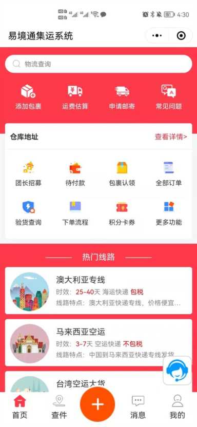 易境通集运系统小程序提供运费查询、用户下单、物流轨迹追踪、会员分销等功能。让客户不需要下载软件,直接在微信小程序即可完成下单操作。