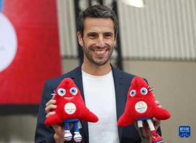 11月14日,巴黎奥组委主席埃斯坦盖介绍吉祥物。新华社记者 高静 摄
