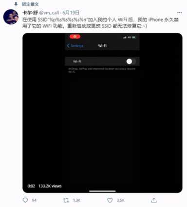 据测试,如果用户连接到一个特殊 WiFi 名称的网络后,设备将会出现严重问题,将直接导致手机网络系统崩溃。