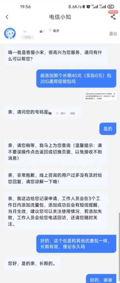 办理入口:直接登陆中国电信app,找人工在线客服,就说要求办理添加 40元20G流量促销包套餐和20GB流量促销减免包-40元套餐 这俩个业务,实现增加0元20g。