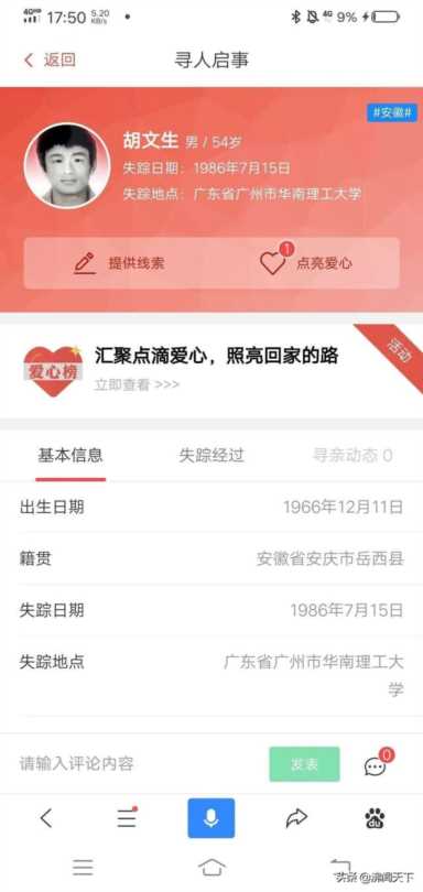 此后,储婧婧更倾向在网上登记胡文生的失踪信息,但她发现已经有人在网上登记过。胡我惠说,胡文生的兄弟也曾多方寻找,胡发祥还曾在南昌出差时拜托当地派出所的朋友多留意。储婧婧目前在很多平台发布过寻找胡文生的消息,包括中国失踪人口档案库、宝贝回家等,但均没有线索。