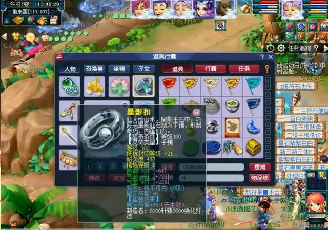 接下来继续来了解一下灵饰装备的配置情况。以女儿村门派为例,作为固伤输出的门派,前排配置的属性必然离不开固定伤害属性。因此戒指配置了120级装备,主属性为防御,下排附加了双固定伤害与伤害属性,精炼了7级星辉石,点化了6级锐不可当特效。