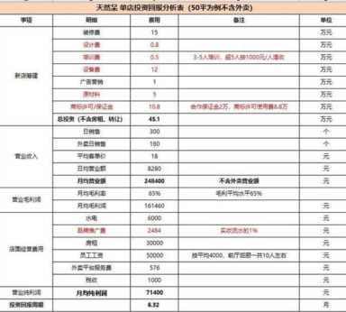而这一数据与招商团队提供的差距着实不小。官方提供的单店投资回报分析表上显示,一个50平大小的门店,日销售应超8000元,平均毛利率是65%。负责人举例称,“比如商铺的流水是在10万左右,一个月的毛利润是在6.5W左右,这个毛利润扣掉水电房租就是纯利润。”