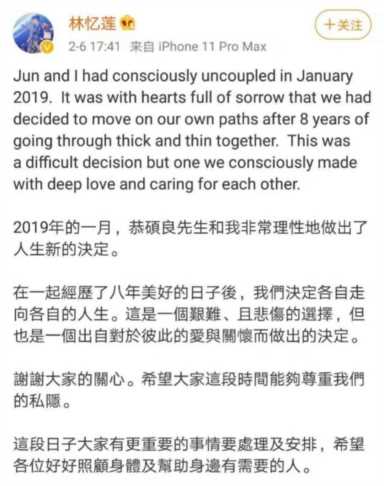 2月6日,据台媒报道,53岁林忆莲与小11岁音乐人男友恭硕良已经分手。林忆莲发文称,”在一起经历了8年美好的日子后,我们决定各自走向各自的人生”,同时对大家的关心表示感谢,希望大家能够尊重他们的隐私。