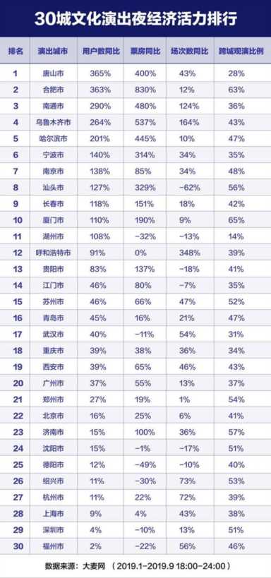 日前,大麦网发布全国30城文化演出夜经济活力榜单,今年1-9月,全国30城夜间文化演出观演规模同比上涨,其中唐山用户增速最快高达365%,合肥、南通、乌鲁木齐、哈尔滨紧随其后,增速均超200%;广州领衔一线城市夜间文化演出消费活力,用户规模同比去年提升37%,和北京、上海、杭州等夜经济消费力大城市形成各领风骚的发展新态势。