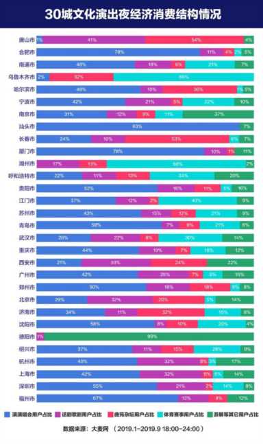 从消费结构上看,演唱会、话剧歌剧、曲苑杂坛、体育赛事四大品类市场消费强劲。合肥、汕头、厦门等南方城市演唱会优势明显,扛起了整个城市文化演出夜经济消费大旗,用户规模高达70%以上;而唐山、乌鲁木齐、长春、济南等北方城市则是曲苑杂坛的市场占有率更高,用户更愿意腾出晚上时间走进剧场。