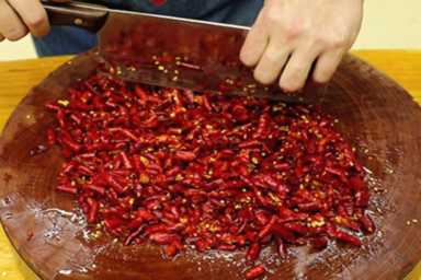 2.做滋粑辣椒:准备一大盘干辣椒,凉水下锅煮5分钟,把辣椒煮软、去除燥性,然后捞出来洗干净,用刀轧碎、或者用料理机打碎,做成滋粑辣椒。
