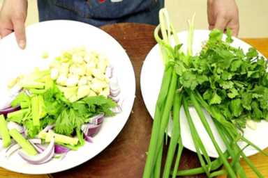3.备葱油炸料:洋葱、芹菜、蒜子、小葱、香菜,该切段切段、该拍扁拍扁,一会炸料油、去腥增香。另外多备点生姜,剁成末备用。