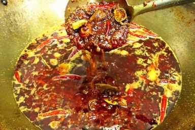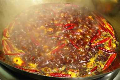6.熬底料:牛油炼好以后用密漏把锅里的料渣打干净,然后把油温烧至5成热,放入滋粑辣椒和香料,小火慢熬15分钟蒸发水分,要不停的搅打以免糊底;15分钟以后放入一大勺豆瓣酱继续熬20分钟,熬出红油和颜色;然后下入生姜末再熬20分钟,整个过程要不停地搅拌,让水分完全蒸发,这样火锅底料才能长时间保存不会坏。
