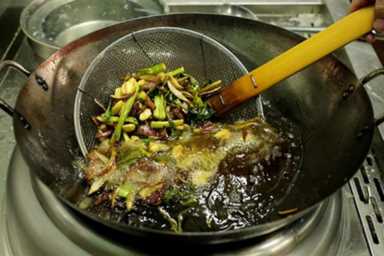 5.炼牛油:锅里加一点水,把牛油放进去,保持小火、勤翻勤搅慢慢炼,一直熬制水分全部蒸发,牛油非常清亮,把油渣打出来,放入洋葱、芹菜、大蒜和小葱一块炸,继续小火提取葱香味,原料发干时再放香菜,继续熬制原料金黄干香捞出不要。