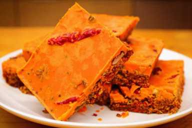 9.成品:看看这卖相,上层全是厚厚的红油,下层全是实打实的酱料,鲜红油润、香辣浓郁,切成小块储存,一次一块方便省事,闲来无事熬一锅,管吃一冬天。