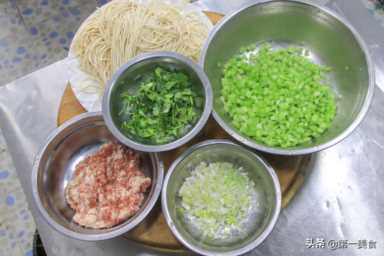 猪肉200克剁成肉末,葱白一根切成葱粒,香菜一小把 切成小段,面条200克放入盘中备用。