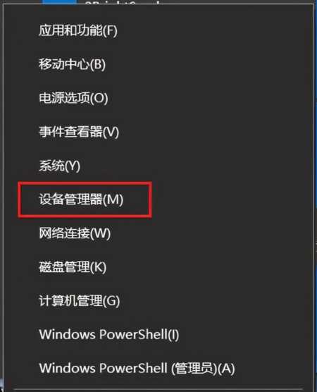 在Win10界面左下角的“开始”上点鼠标右键,弹出菜单中选择“设备管理器”。