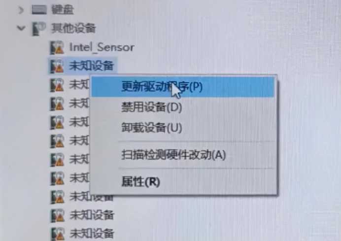 开始以下操作前,先确认已将下载的驱动程序包解压到 U盘,然后在有问题的设备上点右键,选择“更新驱动程序”,将出现下面界面。