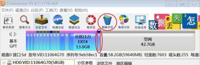 双击启动桌面的“分区管理”,在界面里点第13分区,就是图中红圈中的细长条,然后点右上红圈中的“删除分区”。