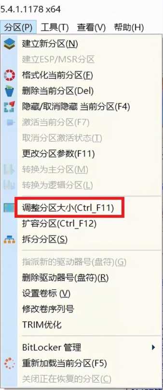调整分区需要使用键盘,所以先打开虚拟键盘,然后选择 DiskGenius 的“分区/调整分区大小”菜单。