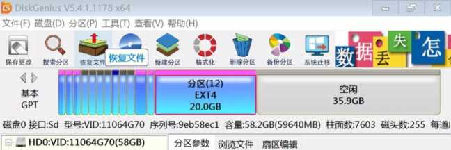 然后在 DiskGenius 左边的方框内选中小米平板的硬盘,一般第一个就是。如果是安卓系统,会有十几个分区,如果是 Win 系统,则只有几个分区。