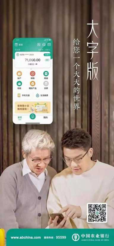 在上线“大字版”的同时,农行掌银也推出了“乡村版”,助力县域建设,为县域客户提供更便捷的金融服务。“乡村版”秉承着简洁、专属、优惠的理念,优化页面设计,将惠农e贷等专属产品配置在掌银首页,方便县域客户使用。(王大志)