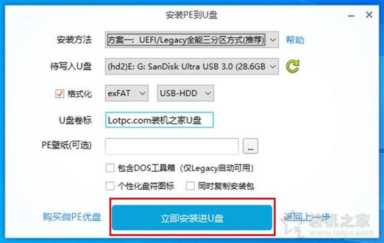 2、安装方法我们就选择方案一吧,待写入U盘选择你插入的U盘(自动识别,电脑插上多个U盘的话,可以下拉选择),格式可以选择FAT32和USB-HDD,U盘卷标就是U盘的名字随便起吧,点击“立即安装进U盘”,如下图所示。