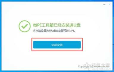 4、直到提示“微PE工具箱已经安装进U盘”,我们点击完成安装按钮,U盘PE工具制作完毕。