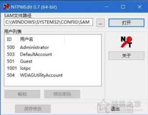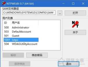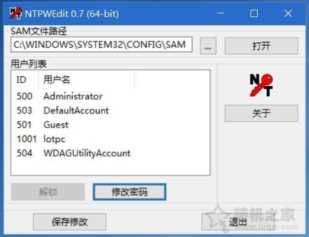 8、这时会弹出NTPWEdit软件,SAM文件路径默认就是C:WINDOWSSYSTEM32CONFIGSAM,SAM文件说白了就是Windows存放密码的数据库文件,我们点击“打开”按钮,就可以列出电脑中所有的用户,如下图所示。