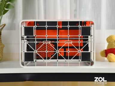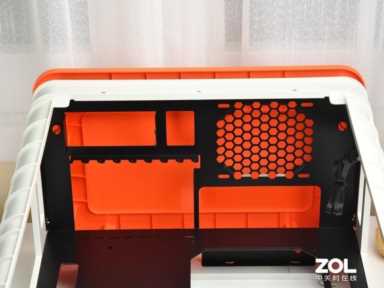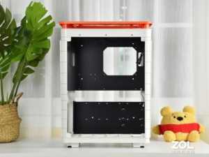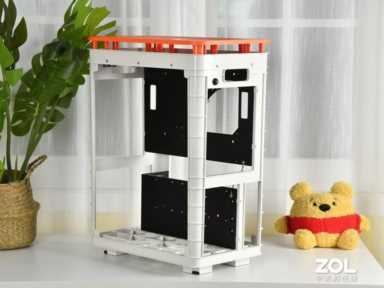 首先先看外观,迎广 ALICE第一眼看上去像是一个置物架,仅保留了主要的边框结构,这种360度的全方位开放设计,让我有一种不加装风扇的冲动。不过官方宣称这种垂直布局,能够实现无阻垂直风道。所以底部和顶部还是要安装风扇的。机身主要是黑白双色,白色有点像米色。顶部也有一个橙色的盖板设计,这种撞色在机箱上显得格外有趣。