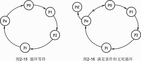 循环等待条件:存在一种进程资源的循环等待链,链中每一个进程已获得的资源同时被 链中下一个进程所请求。即存在一个处于等待状态的进程集合{Pl, P2, …, pn},其中Pi等 待的资源被P(i+1)占有(i=0, 1, …, n-1),Pn等待的资源被P0占有,如图2-15所示。