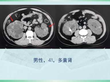 男性,41岁,乏力、尿血、小便疼痛发现多囊肾、多发肾结石和输尿管结石,化验肾功能减退。