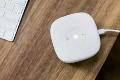 整体机身三围:90mm*90mm*50mm,重量约210g。顶部是控制键及4个拾音孔,控制键上有指示图标,功能直观明了。工作期间RGB多色状态指示灯可以透过上盖显示。