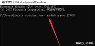 5、然后输入:net user Administrator 123456命令,回车即可将Administrator账户的密码修改为123456,如果想更换其他账户,操作方法类似
