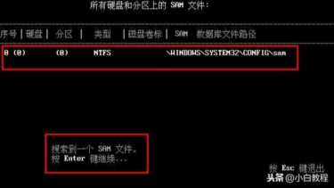 5、自动搜索此分区中的文件sam,在提示已经搜索到“sam”文件了后我们按回车键继续。注意:sam的全称为:security account manager,意思是安全账号管理器,其作用是对windows账户安全管理