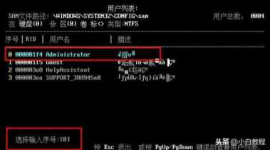 6、此时所列出的是电脑的所有账户信息,找到对应的需要清除账号的密码。比如你要清除“administrator”账户的密码,那么直接输入序号0即可,之后按下回车键。