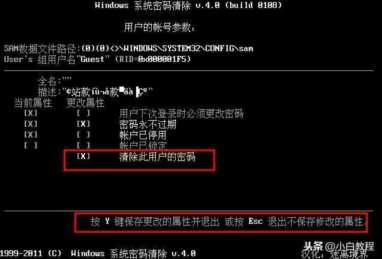 7、此界面时按下“Y”键即可清除当前用户登录的密码!如果提示已清除账户密码成功后可直接重启电脑。