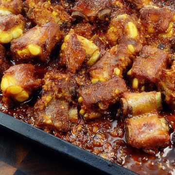 2.烤箱预热10分钟,把烤盘铺上锡纸,把肉片均匀的铺上放入烤箱,上下火200度烤20分钟,不用刷油因为肉会出好多油,烤好把肉翻面再烤15分钟。因为烤箱不同温度时间大家可以自己观察调整。