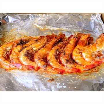 3.虾沥干水分,在看烤盘上铺一张锡纸,将虾平铺在烤盘内