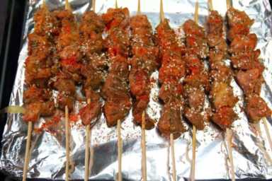 3.将腌好的肉块穿成肉串。