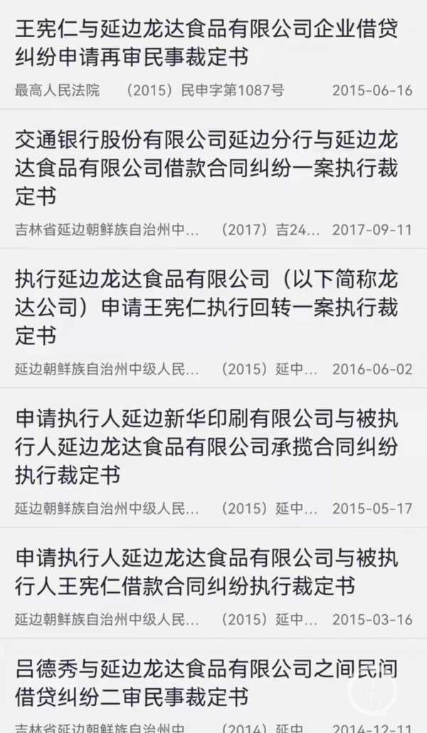 上游新闻记者查询中国裁判文书网,得到的信息却跟他的自述颇有出入。仅2014年开始,姜元陈的延边龙达食品有限公司涉及的诉讼就达到181条,他几乎全部都是以被告的形式出现,并没有任何别人向他借钱的信息,也没有他向所谓供应商催款的诉讼。这些欠款从2000年初开始欠下,到2014年后开始不断被法院判令偿还,姜元陈的公司也开始不断爆雷。