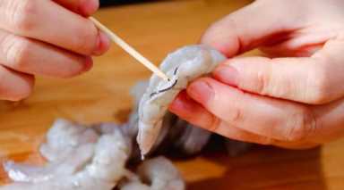 1.将青虾清洗干净后,用刀沿着虾背划开,去掉虾壳和虾线,保留尾巴;